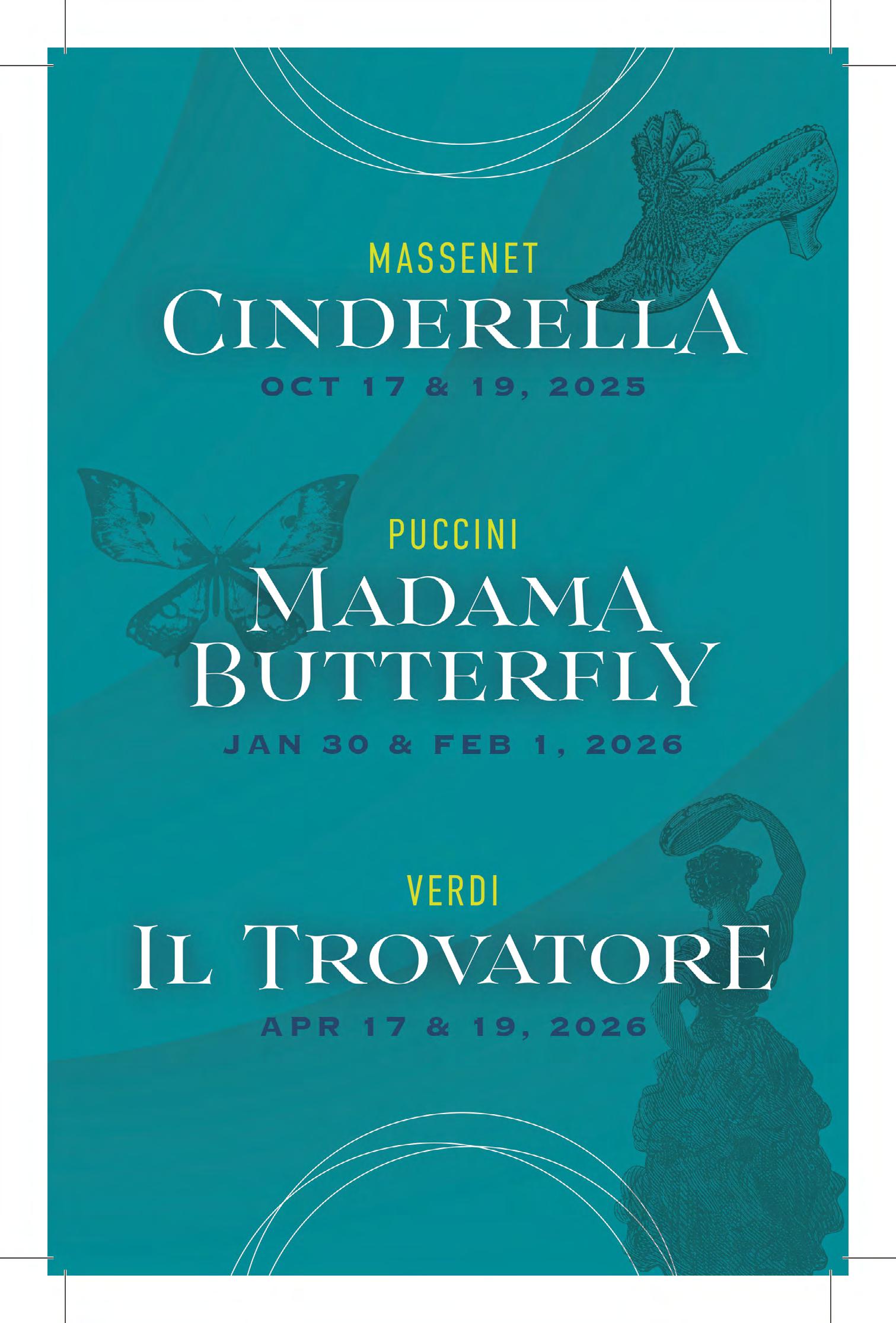 We are proud to announce our 2025-2026 season, in which we will for the first time have three fully-staged productions on our subscription series, all of them right here in Memorial Auditorium. The season will begin with the company premiere of Jules Massenet’s enchanting version of CINDERELLA in October, will continue in January with Puccini’s beautiful and heartbreaking MADAMA BUTTERFLY, and will conclude in April with the long-awaited return to the company of Verdi’s almost impossibly tuneful IL TROVATORE. Subscribe now to get the best seats at the best prices, and help us continue the celebration of our 15th anniversary! You can subscribe here at the theater today, or by visiting NCOPERA.ORG.