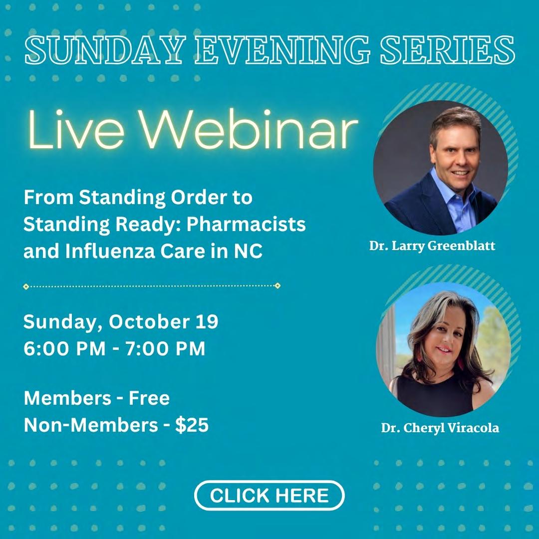 The Sunday Evening Webinar Series has presented many varied topics so far this year. Our next webinar will be on Sunday, October 19th. Cheryl Viracola, PharmD, NCAP’s Director of Practice Advancement and Dr. Larry Greenblatt, State Health Director NC DHHS will present From Standing Order to Standing Ready: Pharmacists and Influenza Care in NC. Visit our webinar page to learn more and register. This event will be ACPE accredited for 1 hour of live CE for pharmacists and pharmacy technicians.