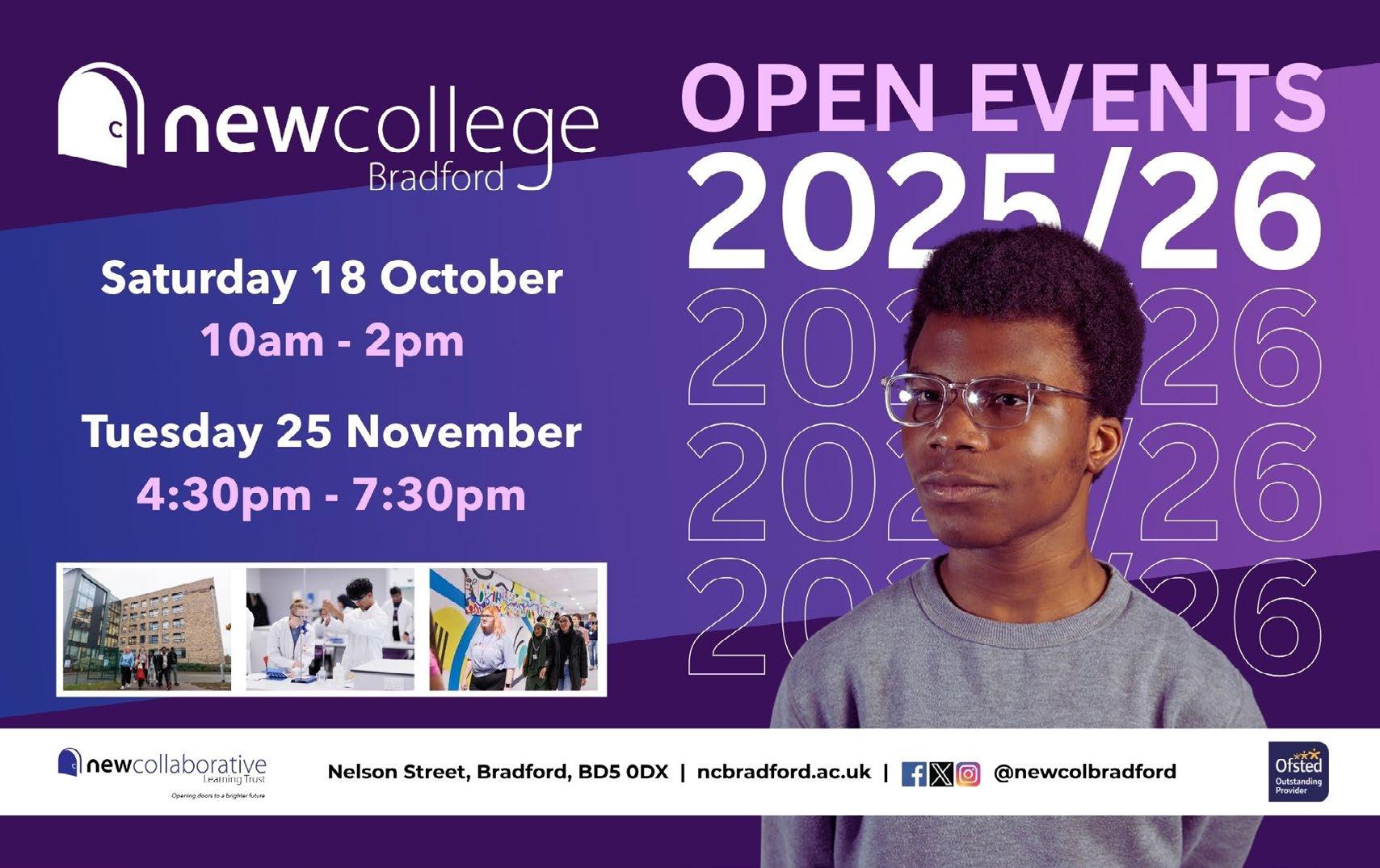 If you have any questions or queries about anything related to applying to New College, then please contact student services on 01274 089189 or the school liaison team: info@ncbradford.ac.uk Saturday, 18th October 2025: 10:00am ā 2:00pm Tuesday, 25th November 2025: 4:30pm - 7:30pm