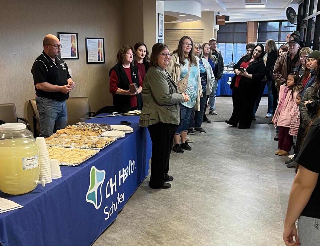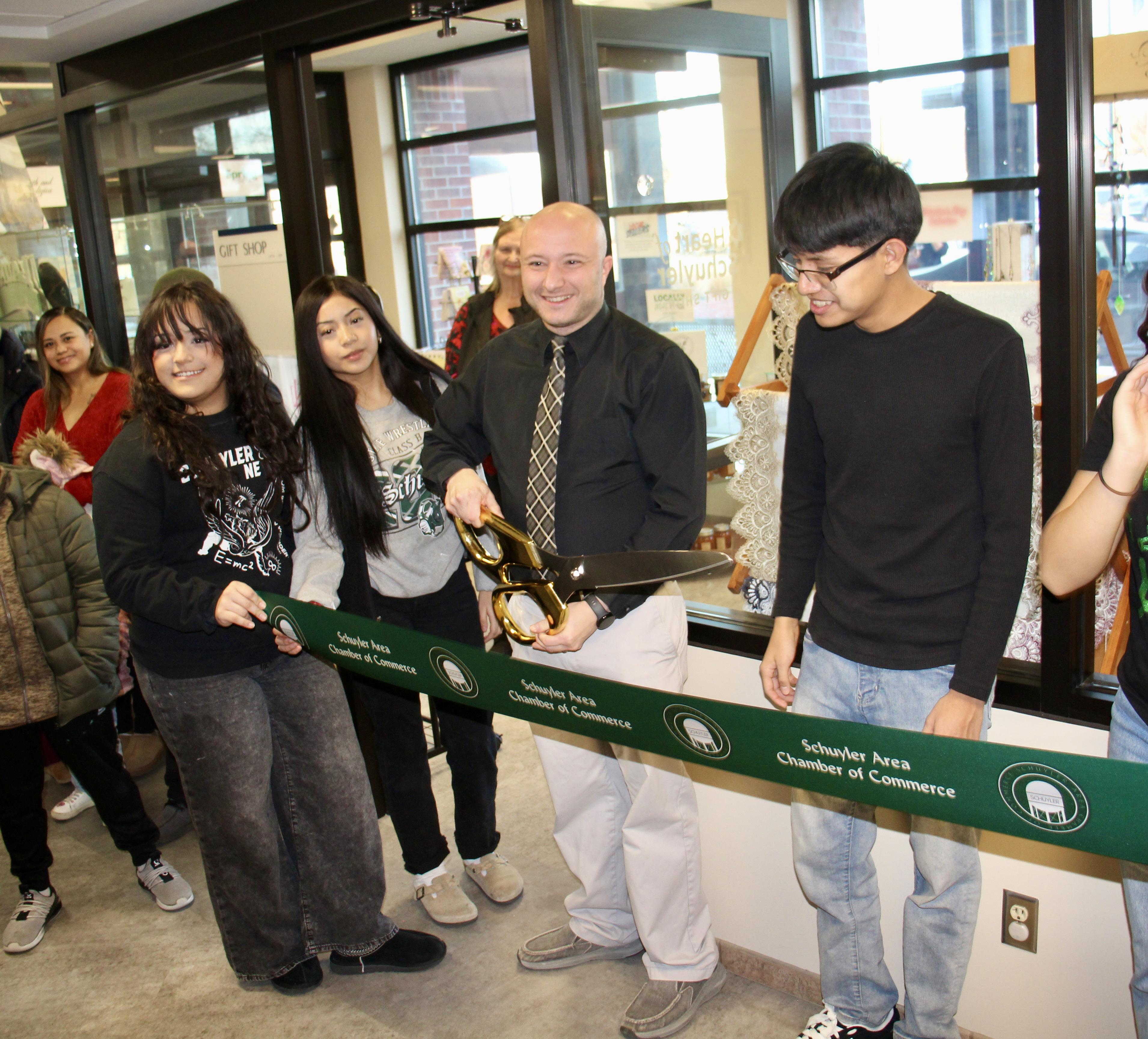 Schuyler Central High School business teacher Grant Torpin (holding the scissors) prepares to cut the ribbon, officially signaling the opening of the Heart of Schuyler Gift Shop inside the CHI Health hospital in Schuyler. NPSA featured the student-launched business in mid-February.