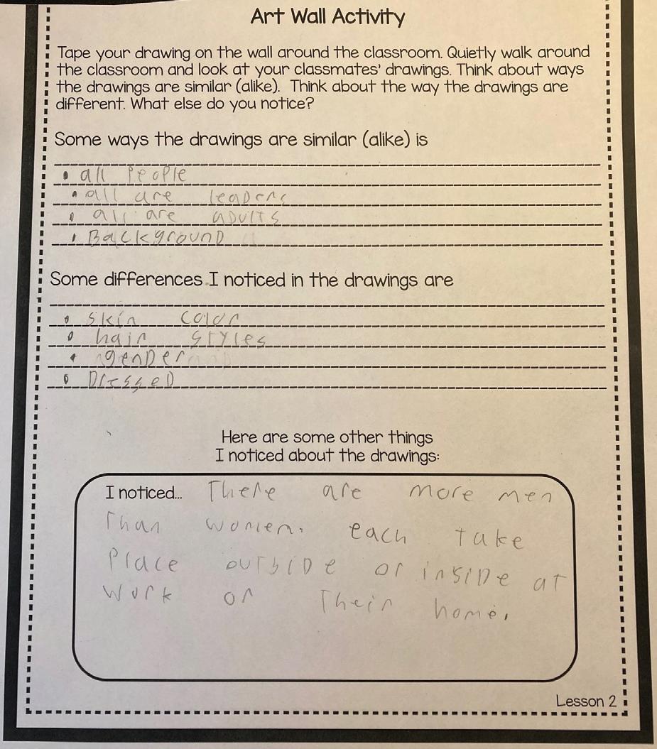 Students then open their eyes and draw what they imagined, using crayons, colored pencils, or markers that ideally include various skin complexion colors. Once their drawings are complete, the students respond to these prompts: