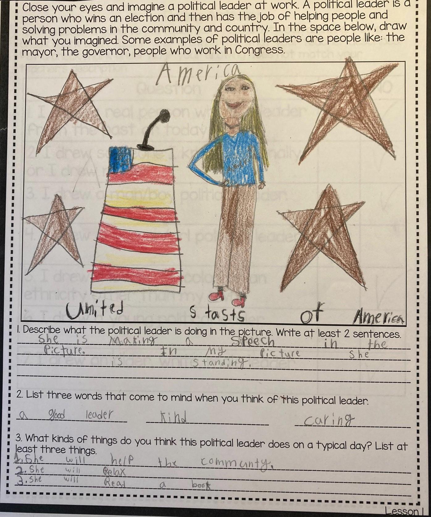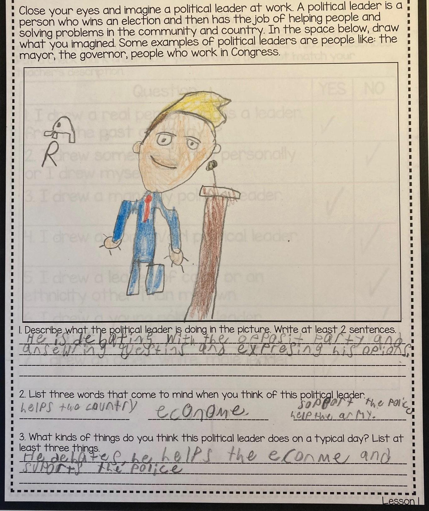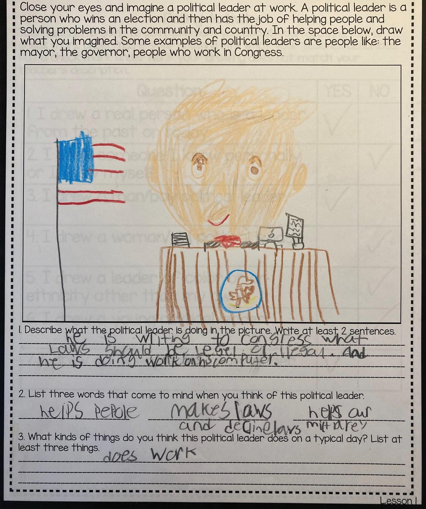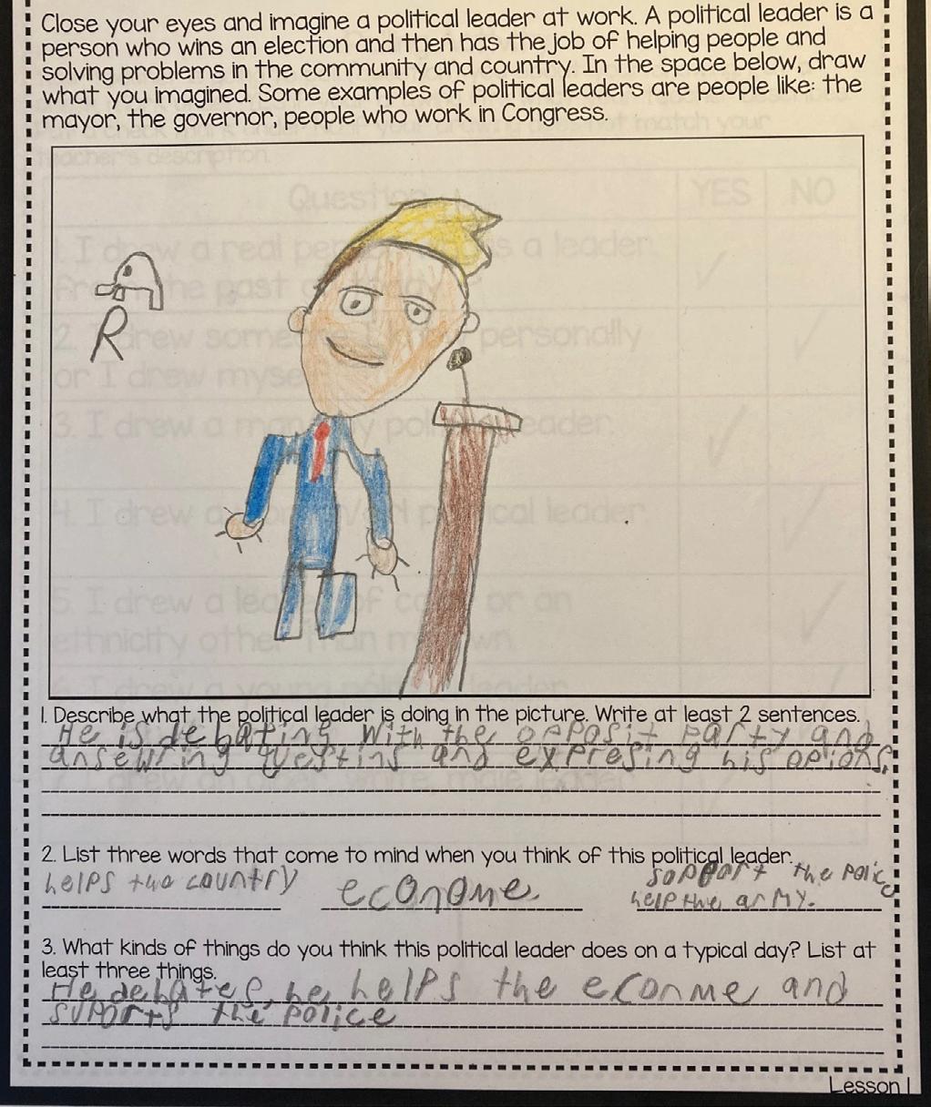 For decades, the Draw-a-Scientist task has been used successfully in elementary classrooms to spark conversations about scientists and science. We adapted that tool to the world of politics, creating the Draw-a-Political-Leader (DAPL) activity. Appropriate for K–5 classrooms, this exercise opens with students creating their own drawings. In order to encourage students to reflect upon their visions of political leadership more deeply, we recommend classroom discussion of the students’ drawings. We also suggest a follow-up activity focused on gender stereotypes for students in grades 3–5. Brief summaries of these activities and examples of students’ work follow; detailed lesson plans are available online (see Teaching Resources box).