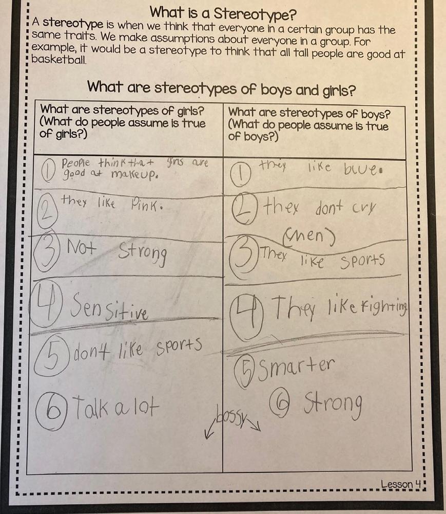 An extension of the DAPL activity for grades 3–5 focuses on stereotypes of women and men. To introduce the concept of stereotypes, the teacher uses language such as the definition at the top of Figure 4. Next, working in pairs or small groups students create lists of gender stereotypes, focused around answering these questions: What assumptions do we make about the way women and men act? The activities they enjoy? Throughout, students are reminded that they do not need to believe the stereotypes but should share what they believe that other people think.
