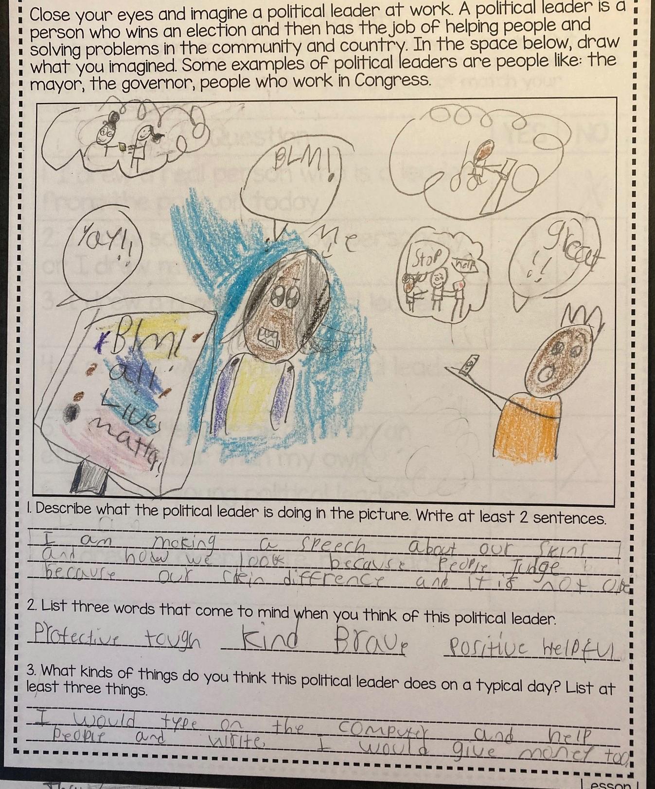 Either activity concludes with the students discussing what types of political leaders were drawn the most and drawn the least in their classroom. They are encouraged to discuss who and what they drew and also whether political leaders tend to have certain identity characteristics but not others. This is also a good opportunity for the teacher to point out that women and people of color have been underrepresented in political leadership both historically and currently in the United States.