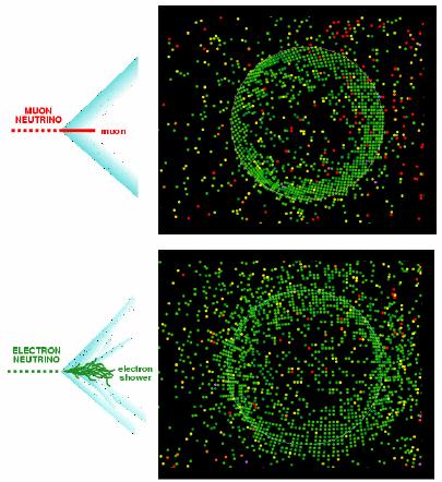 cone (Figure 3). The rings of light produced by muon neutrinos are relatively sharp, while electron neutrinos result in a more diuse ring because electron neutrinos produce electrons, which then scatter photons more effectively than the muons produced by muon neutrinos (Kaneyuki). Also, the direction of the light cone is the direction of the particle produced by the neutrino, which is extremely close to the incident direction of the neutrino and thus points to the direction of the neutrino source. Lastly, the number of photons produced lets scientists know the energy of the particle and allows the energy of the neutrino to be inferred.