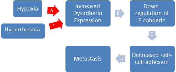 In this report we attempt to show that both hypoxia and hyperthermia may induce an increase in dysadherin expression, partly explaining both hypoxia- and hyperthermia-induced metastasis. This provides the missing link (step A in the schematic below), between hypoxia, hyperthermia, and metastasis.