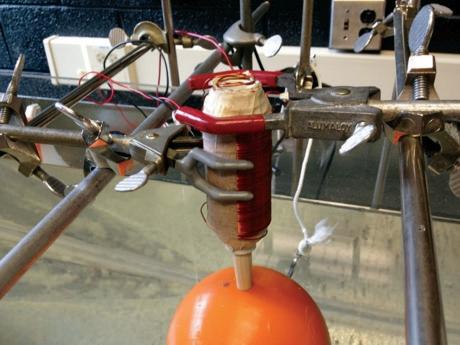 Figure 7. Ellipsoid buoy, slack anchored by two hooks, supporting a stack of magnets within the coil.