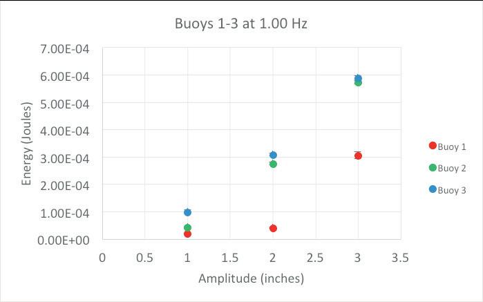 Figure 15: This graph shows the data points of 1.00 Hz, graphing Energy captured per wavefront against amplitude. The colors indicate the buoy; red for Buoy 1, green for Buoy 2, and blue for Buoy 3.