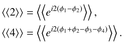 The average 2-particle and 4-particle azimuthal correlations over many events may be written as follows, where we denote two averages, first over all particles in an event and then over all events: