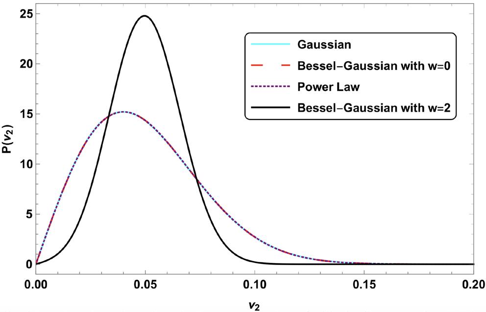 The probability distributions are plotted so that the expected value of elliptic flow remains 0.05. We define w = for the Bessel-Gaussian distribution. When w = 0, the Bessel-Gaussian distribution reduces to the Gaussian distribution. We see the Gaussian, Bessel-Gaussian with w = 0, and Power Law curves are all very similar, while the Bessel-Gaussian curve with w = 2 differs from the other three curves.