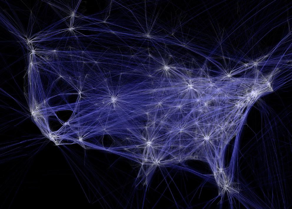 Visualizing patterns of air traffic over the contiguous United States reveals major airports and commonly flown-over regions. The darkest areas receive little-to-no flyovers. Image credit Aaron Koblin, Scott Hessels, and Gabriel Dunne, UCLA.