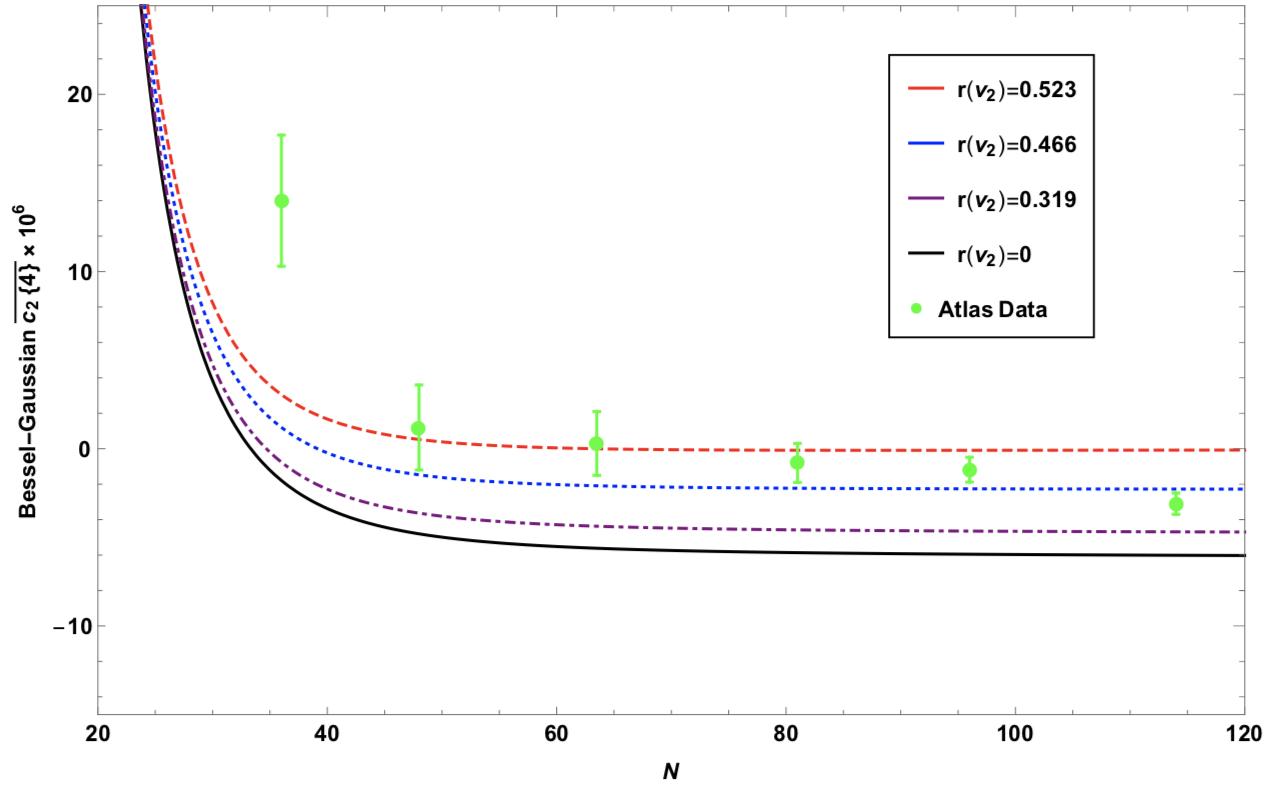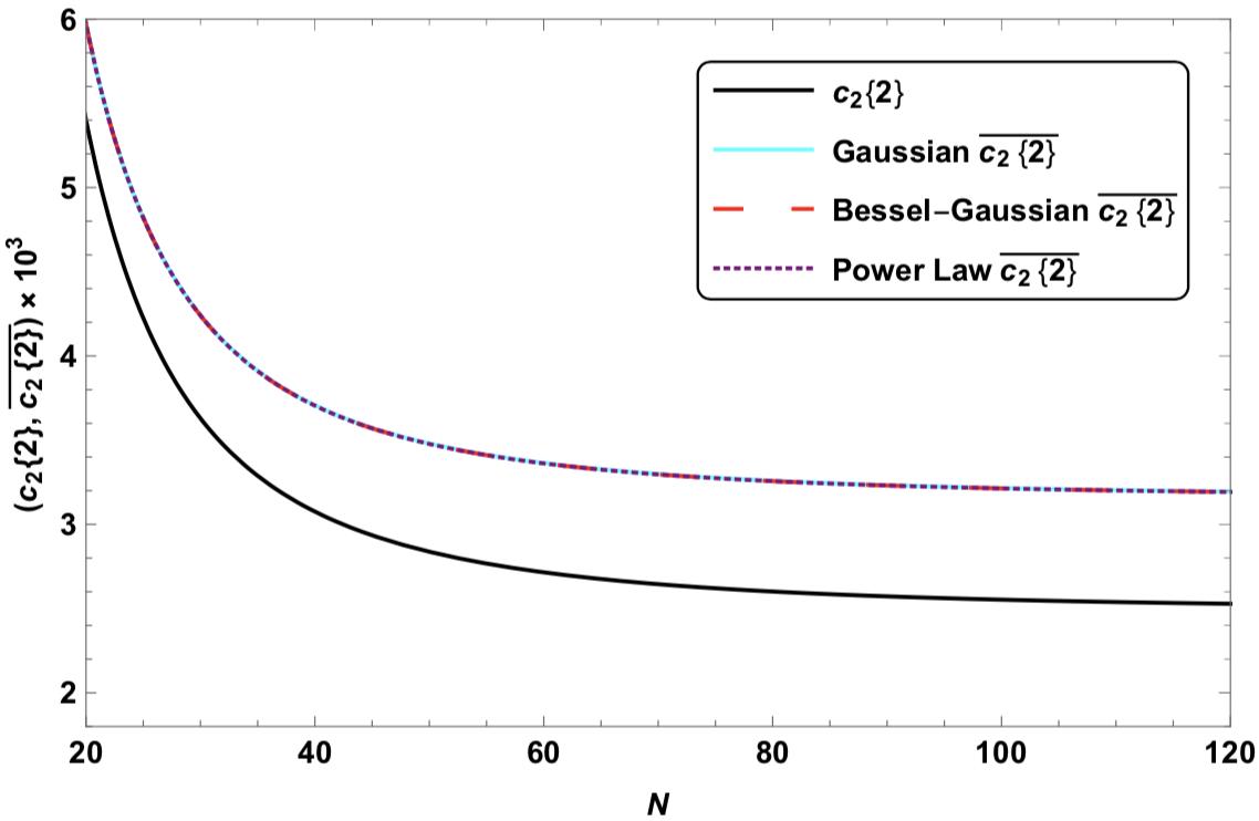 The event-averaged 4-particle cumulant approaches for large N. Specifically for the Gaussian distribution, from section 3.1, the Gaussian approaches 0 regardless of σ. Because we set the variance of the Bessel-Gaussian distribution equal to that of the Gaussian distribution, and is similar to that of the power law distribution, the behaviors of all three distributions are very similar. More general features of the Bessel-Gaussian will be shown in section 3.5.