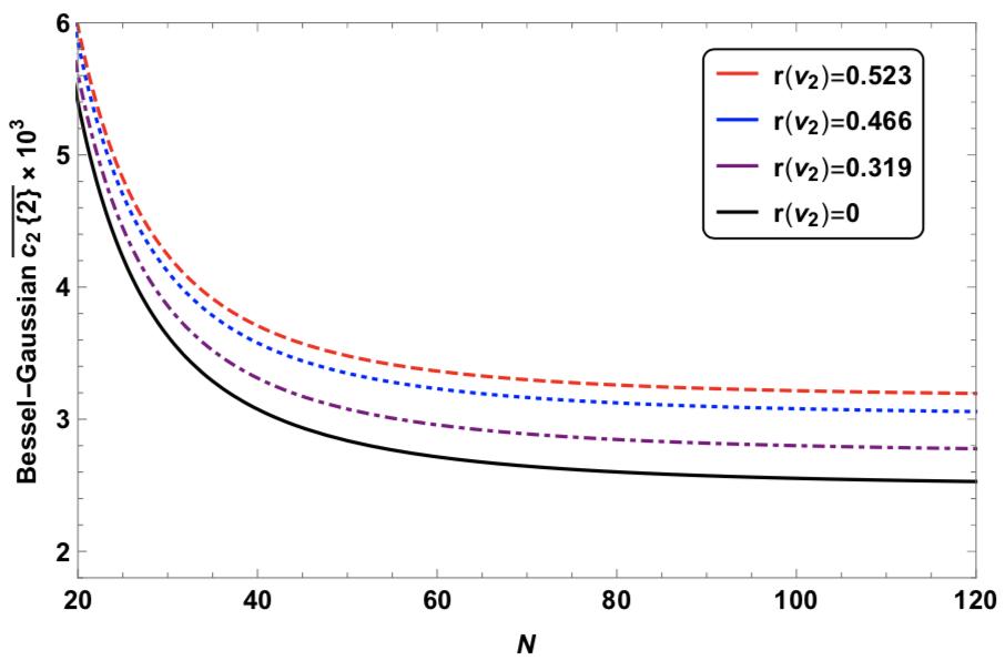 To visualize our results, we plot in Figure 5 the BesselGaussian 2-particle and 4-particle cumulants for varying relative fluctuations of v 2 under the condition that = 0.05. These relative fluctuations were chosen so that r(v 2) = 0.523, 0.466, 0.319, and 0 correspond with w values of 0, 1, 2, and ∞ respectively.