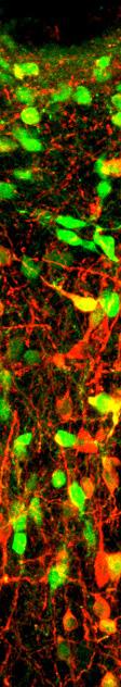 This image of the dorsal raphe nucleus labels dopamine neurons in green, red, and yellow. This region of the brain is critical in generating the increased sociability that typically occurs after a period of social isolation. Image credit Gillian Matthews, Ungless Lab, Imperial College London.