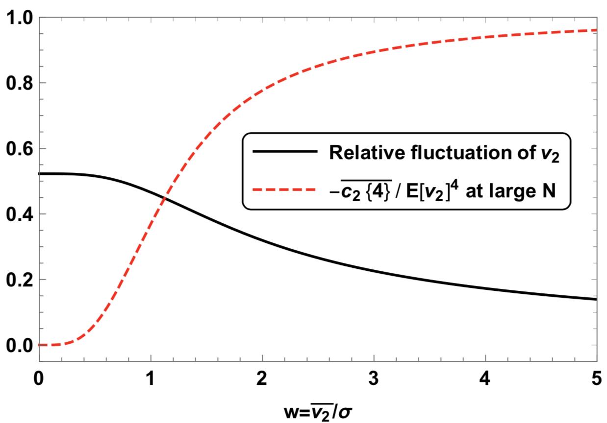 When we equate the variance of the Bessel-Gaussian distribution to that of the Gaussian distribution, we obtain w = 0, and the maximum relative fluctuation (fig. 3). The corresponding large-N limit of for w = 0 is 0. On the other hand, for large w, relative fluctuations are small (fig. 3). In that limit, the Bessel-Gaussian eventaveraged 4-particle cumulant will approach the results obtained through TMC that neglected v 2 fluctuation, i.e. at large N, and so the relative fluctuation for small w approaches 1.