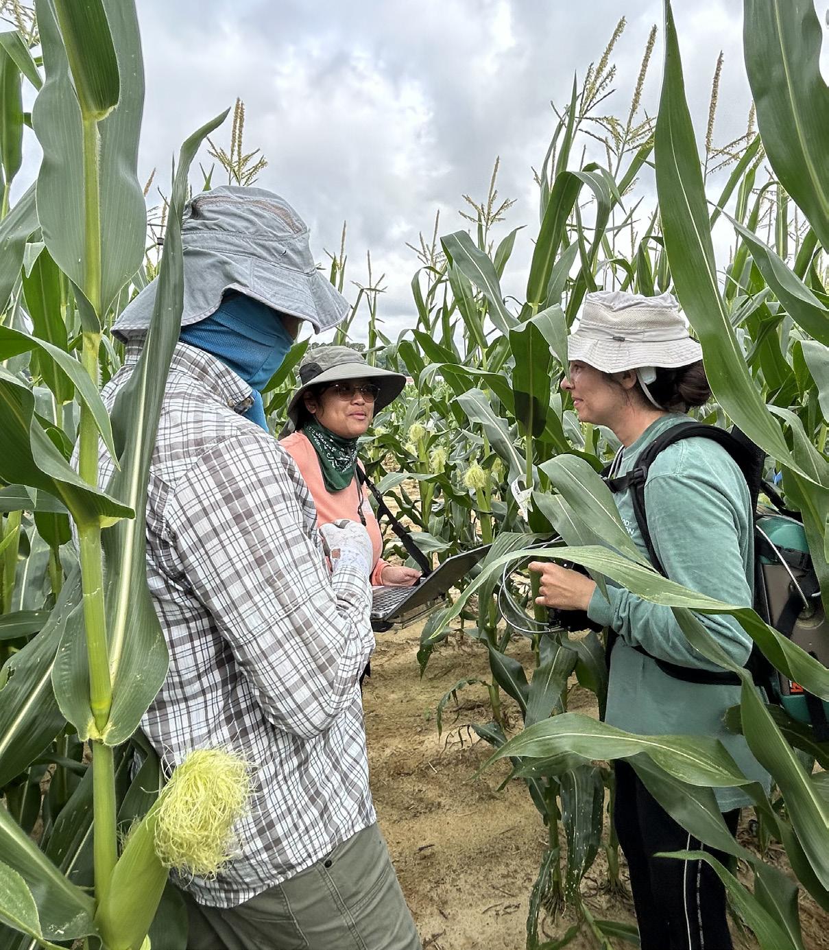 Top: Research technician Lina López Corona tests nitrogen levels in the soil of a cornfield at the Central Crops Research Station. Bottom: (L-R) Rubén RellánÁlvarez, research technician Carolina Escalona Weldt and doctoral student Hannah Pil measure nitrogen in corn leaves.