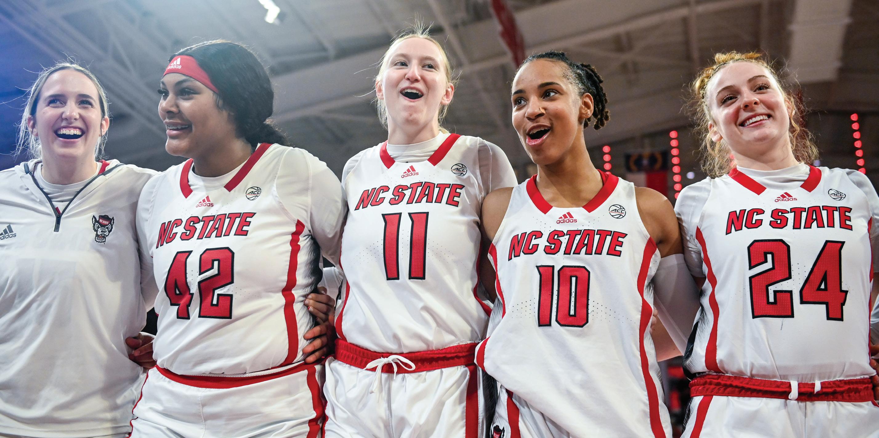 The NC State women’s basketball team sings the alma mater after the game against Florida State in Reynolds Coliseum on Thursday, Jan. 5, 2024. NC State beat Florida State 88-80 in overtime.