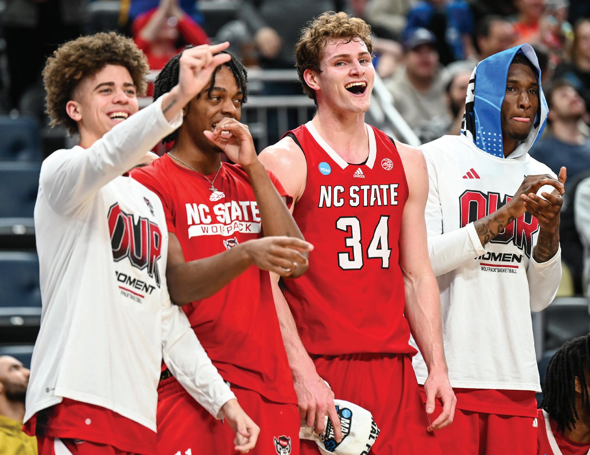 The NC State bench celebrates during the first round game of the NCAA Tournament against Texas Tech at PPG Paints Arena in Pittsburgh on Thursday, March 21, 2024. NC State beat Texas Tech 80-67.
