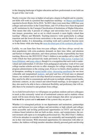 to the changing landscape of higher education and how professionals in our field can be part of this vital work. Nearly everyone who stays in higher ed and gets a degree in English and its constituent fields will work in a position that emphasizes teaching—as Manzo and Mitchell reported in Inside Higher Ed in 2018, “In 2015, there were more than 3,000 four-year colleges and universities in the United States, and 115 of those have been designated as R1 institutions by the Carnegie Classification of Institutions of Higher Education. That means that only 4 percent of colleges and universities have a reward structure (tenure, promotion, and so on) in which research is more highly valued than teaching” (Manzo and Mitchell). Teaching-intensive work (particularly in college transition and the lower-division curriculum) is the norm and the future of a career in English studies. It is demanding, rewarding work and is poised to become more so in the future while also being the most devalued part of the academic job profile. Luckily, we can learn here from two-year colleges, who have always served student populations with extra-academic demands on their time, labor, and attention and barriers to higher education, and whose primary faculty responsibility has been teaching. However, the 2022 CCCC Chair’s Address is not another call to value TYC work (which has been persuasively made previously by John Lovas, Carolyn Calhoon-Dillahunt, and many others), though it is a recognition that such work is undervalued and understudied. I will draw from pedagogical and policy work of two-year college teacher-scholar-activists to offer strategies for college writing teachers and program administrators in the coming years. Even as we finish a third academic year of disruption, resulting in mental health crises, decreasing enrollment for our most vulnerable and marginalized students, and grief and loss of loved ones or planned futures, our students need to develop rhetorical awareness and information literacy; they need to be able to communicate and advocate in multiple settings (social media, electronic contexts, at city council and school board meetings, in newspapers), and they also need to be able to have a rhetorical flexibility and proficiency that will enable them to be retained to and graduate from college. As we look forward to how we will prepare our graduate students and new colleagues to teach in this extremely varied set of institutional contexts and to students whose needs will be more diverse than ever, we need strategies that allow our programs to both be of the system and to ask more of the systems they are part of. Whether it is reimagined policies in our departments and institutions; partnerships across and between two-year colleges and universities or high schools and college; more accessible and inviting professional opportunities in CCCC and beyond; or evidence-based initiatives that are built on data, stories, and counterstories, the current moment calls upon us to strengthen professional ties. The 2022 Chair’s Address will invite attendees to consider how they can sustainably and meaningfully contribute to that vital mission. With structured opportunities for interaction with other attendees, the Address will help member-attendees identify personal goals and develop