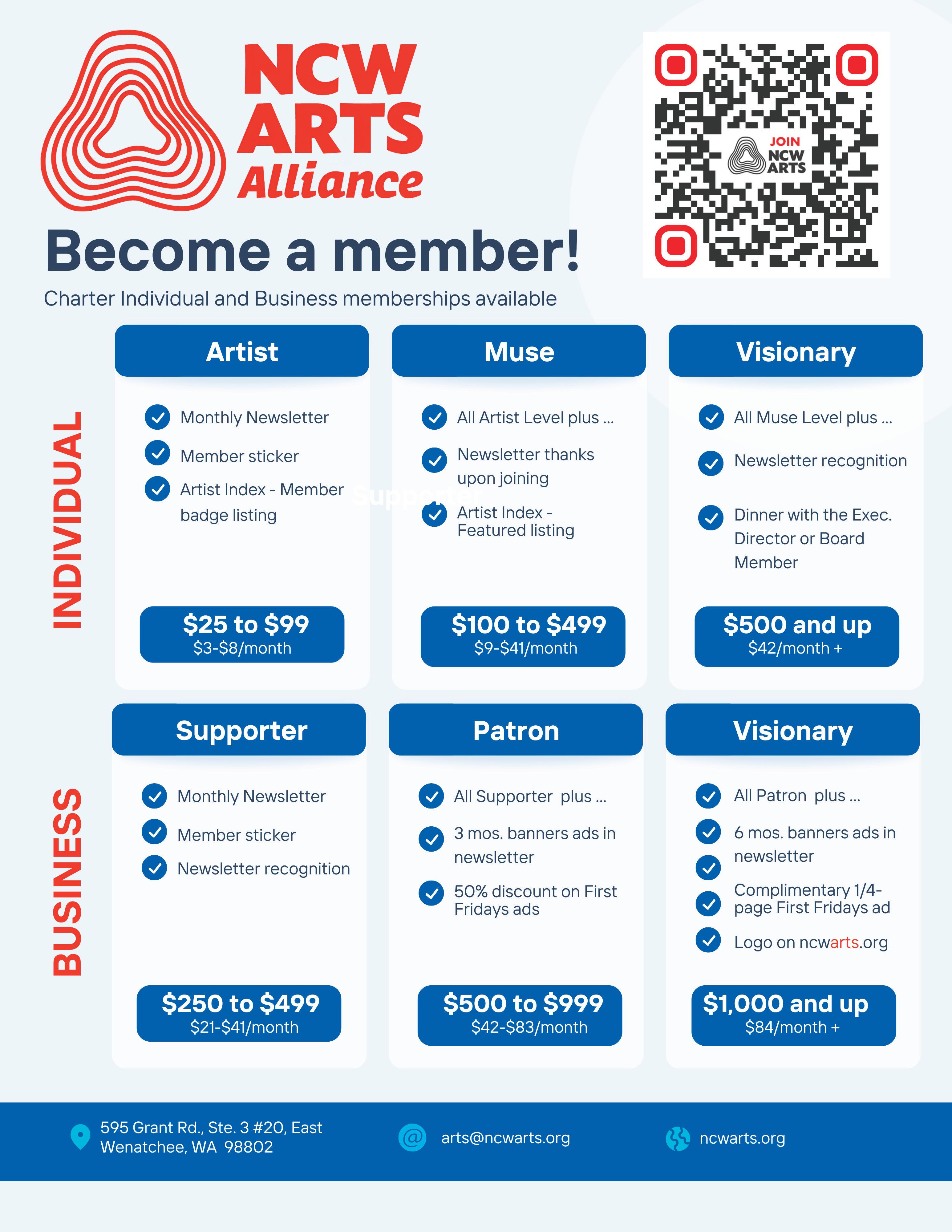 I’m still getting my bearings, but you’ll be able to find me at the Wenatchee First Fridays event in September—please come say hello! Or please feel free to email me directly anytime at director@ ncwarts.org.