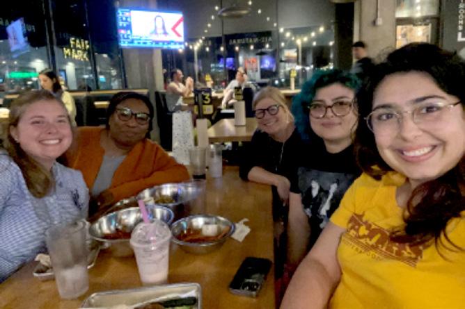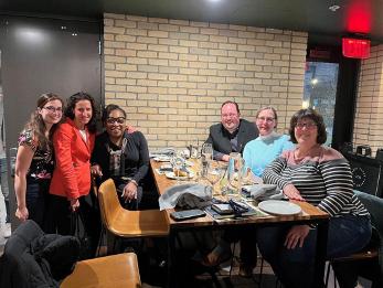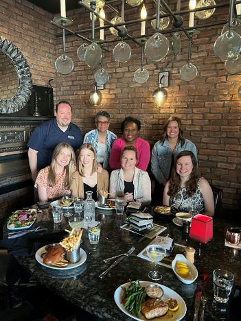 Barbara (Rinker) Cassin ’60, Mary Beth (Fandrey) Goetley ’67, Amanda Nagy ’16, Colleen (Scero) Ruggerio ’96, and Lori (Goetley) Babb ’96 gathered with Tolani Afolabi and Jim Sulier at lunch in Kalamazoo, Michigan.