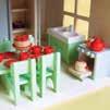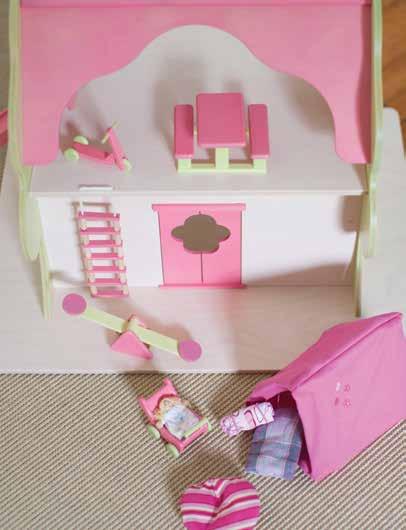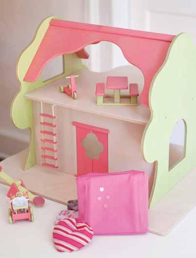 All kids wish for their very own tree house with features like these. Includes door that swings, removable slide, attached swing and ladder, picnic table, seesaw, scooter, baby doll and carriage, collapsible tent, 2 sleeping bags and beanbag. Painted to show natural wood grain with green sides and dark pink roof. Handmade in Germany of wood harvested from sustainable forestry. Adult assembly required. Measures 23.25"W x 19"D x 17"H. r ! (1) #23101A $165