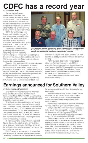 fall and you should have 6-8 days of storage for you peak needs.” Van Zee mentioned the “Tanks of Thanks” Cenex campaign that recognizes community volunteers with a Cenex fuel gift card. Community members can be nominated at http://withyou.cenex.com/ tanks-of-thanks/. North Dakota Farmers Union outreach coordinator Yolanda Zimbleman gave a short NDFU update. Wally Hardie of the N.D. Corn Growers also spoke to the group. He encouraged the audience to talk to candidates and ask them to support E15 fuel. It was announced that 67 stock retirements were made. The retirements totaled $330,683. Elections were held for three directors. Brad Kubela of Wahpeton and Tim Matejcek of Fairmount were reelected to the board. Continuing to serve on the board are Barry Gilles of Wahpeton, Jeff Leinen of Great Bend, Herb Prochnow of Fairmount, Corey Theede of Fairmount and Larry Wiertzema, Jr., Breckenridge. Kubela serves as president, with Leinen as vicepresident and Theede as secretary-treasurer.s