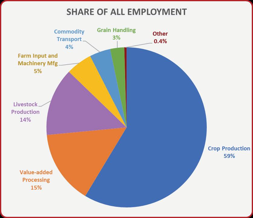 Crop production accounted for 59% of all ag employment at 72,320 direct and indirect jobs, with commodity processing accounting for more than 18,000 and livestock production just under 17,000. Crop production is defined in the study as, “sales, income and expenditures for growing grains, oilseeds and other crops. Businesses that supply inputs and services to crop production represent indirect effects for this segment of the industry.”