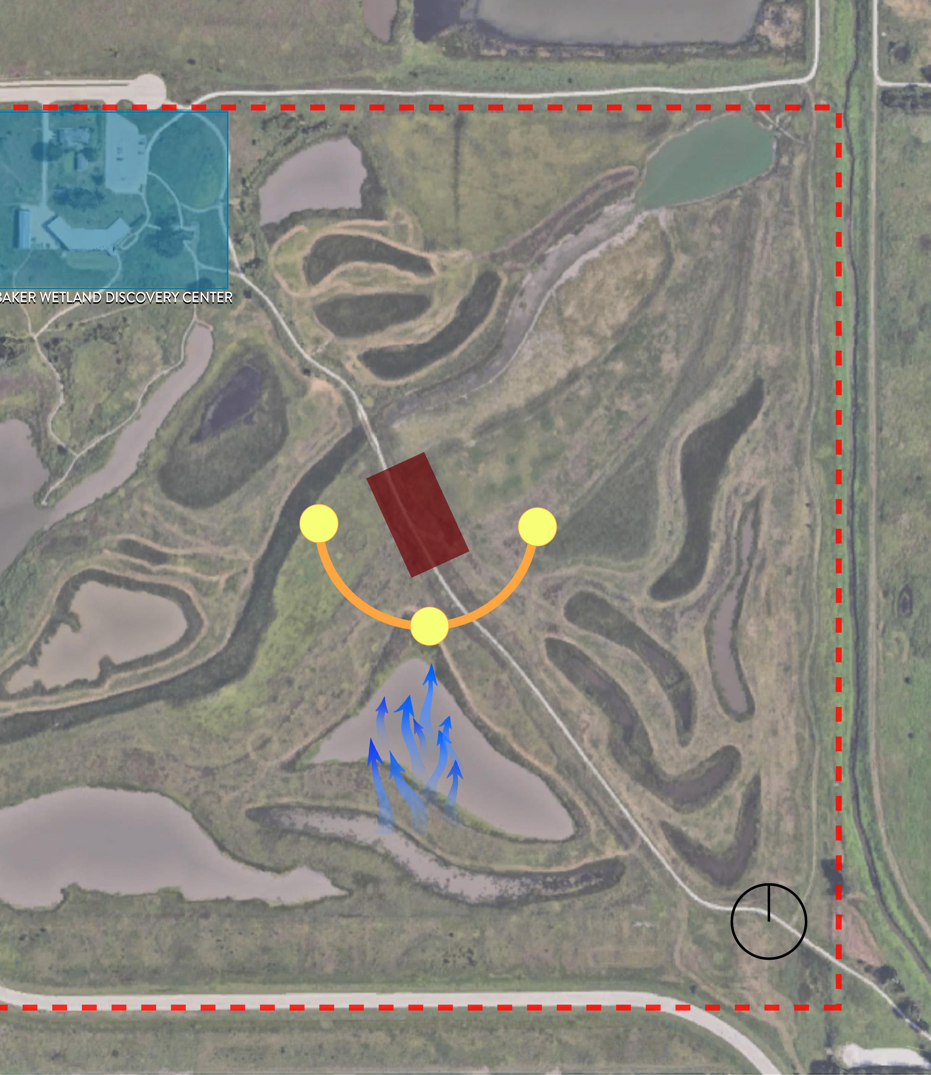 There was a required process of beginning to conceptually think as an architect. We were given the task of creating a space that would connect to the Baker Wetlands and create it as a bird hide for observing using natural and local material in the area. The design also needed to accommodate all types of observers and have ADA-acommodated (Americans with Disabilities Act) entrances. The area and given space were up to us to choose. Having designated the area that would benefit the site the most to create a space of interaction for people that come to the wetlands to interact with nature that occurs there and to create a space of sight seeing that disguises a person from the animal’s nearby, but still creating an interaction with the hide and the habitat around it.