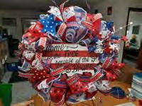 This is a beautiful wreath to celebrate the 4th of July. The red, white and blue ribbon displays a festive look with stars and fireworks. Heather Carlson of Heatheebabyscrafts makes custom wreaths and decorations for any occasion.