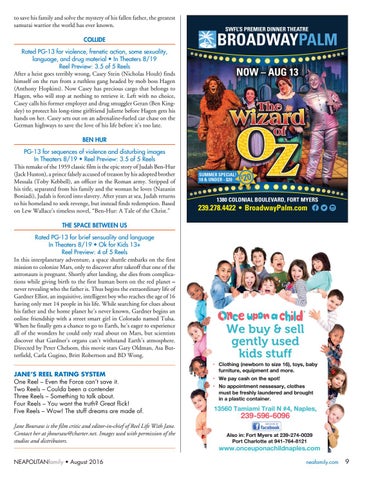 THE SPACE BETWEEN US Rated PG-13 for brief sensuality and language In Theaters 8/19 • Ok for Kids 13+ Reel Preview: 4 of 5 Reels In this interplanetary adventure, a space shuttle embarks on the first mission to colonize Mars, only to discover after takeoff that one of the astronauts is pregnant. Shortly after landing, she dies from complications while giving birth to the first human born on the red planet – never revealing who the father is. Thus begins the extraordinary life of Gardner Elliot, an inquisitive, intelligent boy who reaches the age of 16 having only met 14 people in his life. While searching for clues about his father and the home planet he’s never known, Gardner begins an online friendship with a street smart girl in Colorado named Tulsa. When he finally gets a chance to go to Earth, he’s eager to experience all of the wonders he could only read about on Mars, but scientists discover that Gardner’s organs can’t withstand Earth’s atmosphere. Directed by Peter Chelsom, this movie stars Gary Oldman, Asa Butterfield, Carla Gugino, Britt Robertson and BD Wong. JANE’S REEL RATING SYSTEM One Reel – Even the Force can’t save it. Two Reels – Coulda been a contender Three Reels – Something to talk about. Four Reels – You want the truth? Great flick! Five Reels – Wow! The stuff dreams are made of. Jane Boursaw is the film critic and editor-in-chief of Reel Life With Jane. Contact her at jboursaw@charter.net. Images used with permission of the studios and distributors. NEAPOLITANfamily • August 2016