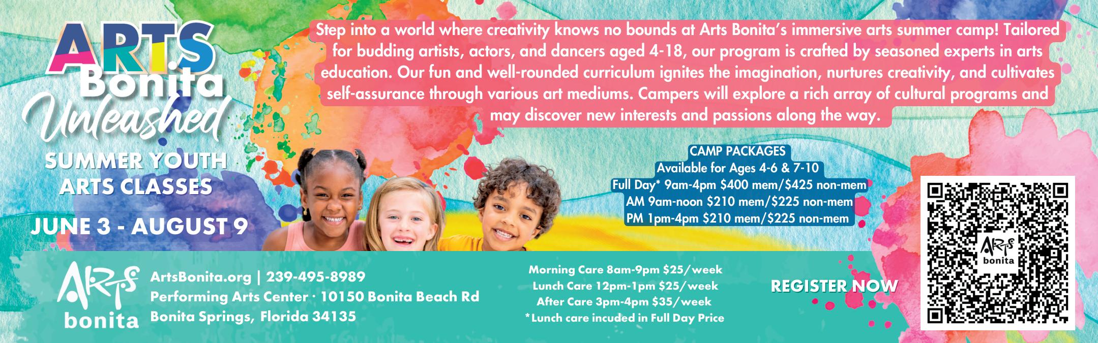 WEBSITE AGES DATES TYPE www.artcenterbonita.org 3-18 years June 5-August 9 Visual & Performing Arts, Specialty www.artisnaples.org/summercamp Grades 2-12 June Performing & Visual Arts https://corkscrew.audubon.org 6-12 years June 3-July 19 Nature www.avowcares.org All ages June 1-August 8 Specialty www.bdanaples.com 3-18 years June & July Dance www.ymcaswfl.org/summer-camp 5-15 years June 3-August 9 General & Specialty www.bgccc.com 6-18 years June 3-August 2 General www.bgccc.com 6-18 years June 3-August 2 General www.camphighlander.com Grades K-10 June 9-July 30 Overnight www.templeshalompreschoolnaples.org 1-6 years June & July General www.childrenforthearts.com 6-15 years June 10-21 Theater Arts www.childmont.com 1-6 years June & July General & VPK www.childproviderspecialists.org Grades K-8 June-August Specialty www.circlefduderanchcamp.com 6-16 years June 9-August 3 Overnight www.naplesgov.com 4-15 years June 3-August 9 Specialty