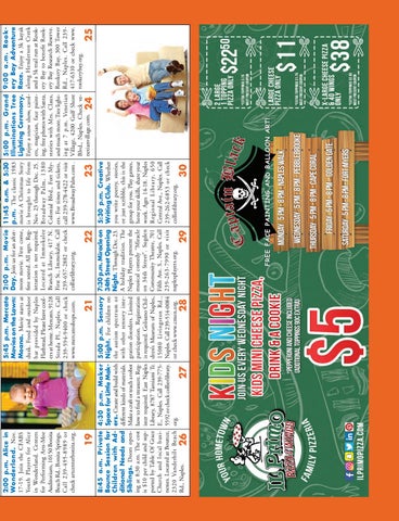 2:00 p.m. Movie Day. Join us for an afternoon movie. First come, first seated. All ages. Registration is not required. Located at Immokalee Branch Library, 417 N. First St., Immokalee. Call 239-657-2882 or check collierlibrary.org. 5:00 p.m. Grand Illuminations Tree Lighting Ceremony. Enjoy a snow show, carolers, magician, face painting, free photos with Santa, stories with Mrs. Claus, and much more. Tree lighting at 7 p.m. Venetian Village, 4200 Gulf Shore Blvd., Naples. Check venetianvillage.com. 24