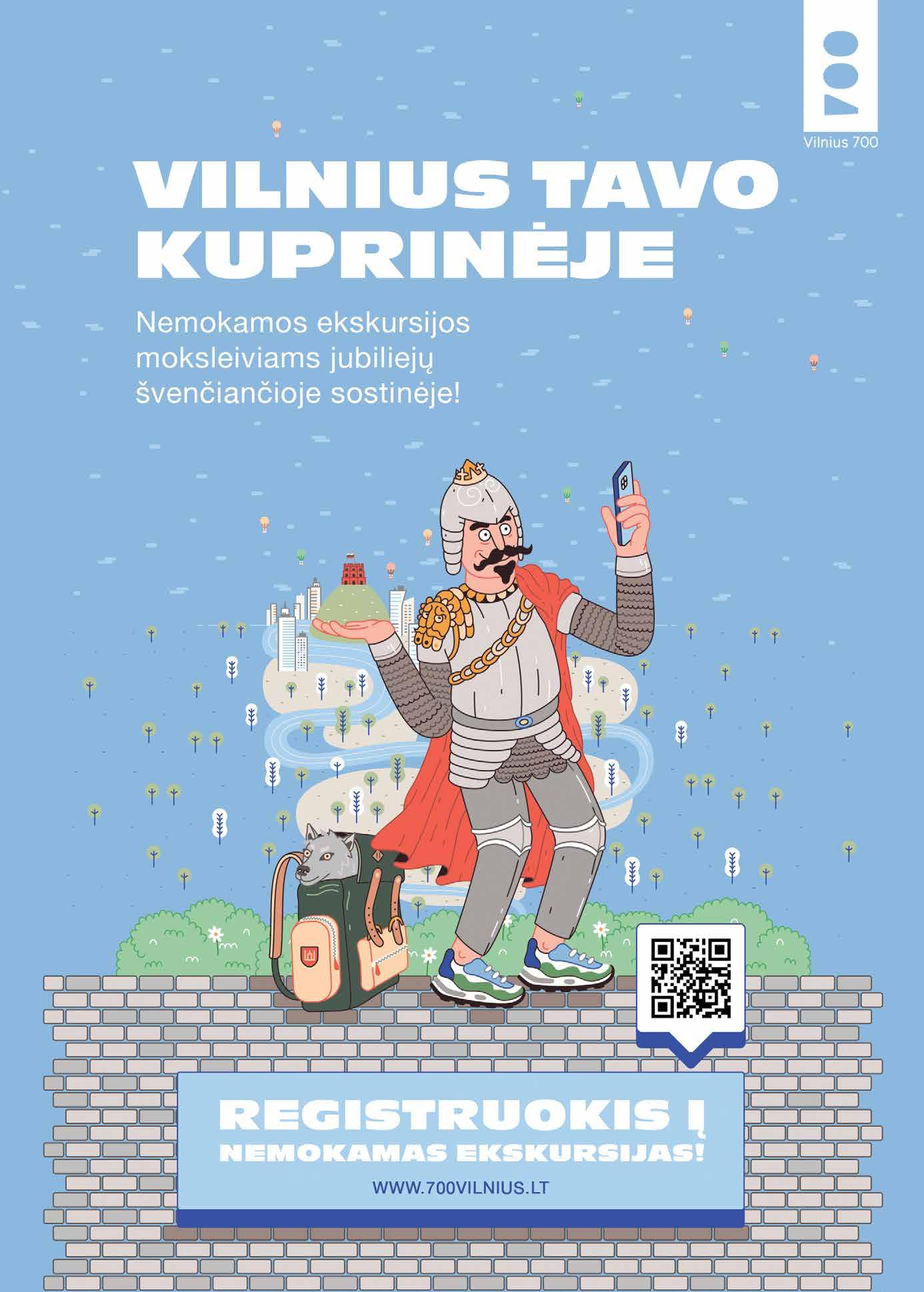 Vilniaus 700 metų jubiliejaus proga moksleiviai kviečiami į nemokamas ekskursijas. Tyrinėsite miestą nuo įkūrimo XIV amžiuje iki XXI amžiaus. Keliaudami vaizduotės laiko mašina ir kojomis kelsitės per šimtmečius, kūrybiškos veiklos atskleis miesto vietų ir žmonių istorijas.