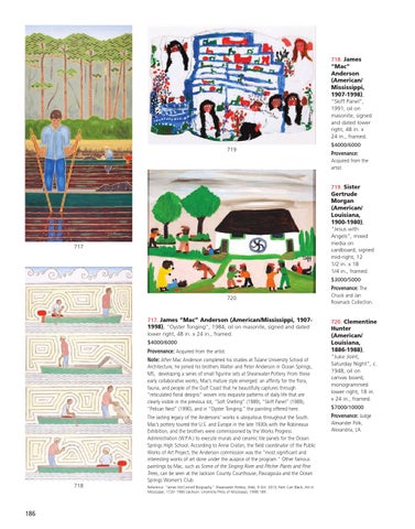717. James “Mac” Anderson (American/Mississippi, 19071998), “Oyster Tonging”, 1984, oil on masonite, signed and dated lower right, 48 in. x 24 in., framed. $4000/6000 Provenance: Acquired from the artist. Note: After Mac Anderson completed his studies at Tulane University School of Architecture, he joined his brothers Walter and Peter Anderson in Ocean Springs, MS, developing a series of small figurine sets at Shearwater Pottery. From these early collaborative works, Mac’s mature style emerged: an affinity for the flora, fauna, and people of the Gulf Coast that he beautifully captures through “reticulated floral designs” woven into exquisite patterns of daily life that are clearly visible in the previous lot, “Soft Shelling” (1989), “Skiff Panel” (1989), “Pelican Nest” (1990), and in “Oyster Tonging,” the painting offered here.