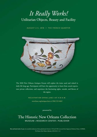 The 2018 New Orleans Antiques Forum will explore the items used and valued in daily life long ago. Participants will have the opportunity to learn from noted experts, tour private collections, and experience the fascinating sights, sounds, and flavors of the region. R EG I S T R AT I O N O P EN S J U N E 4 AT 9 : 3 0 A . M .