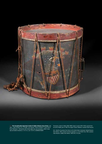 111. The Exceptionally Important Jordan B. Noble Infantry Snare Drum, early 19th c., label inscribed in ink “JB Noble” and engraved “Klemm & Brother’s / Piano Forte & Music Warehouse,” shell painted with Federal eagle, brass tack decoration, calfskin heads, rope and leather tensioners, h. 16 1/2 in., dia. 16 3/4 in. $200000/250000