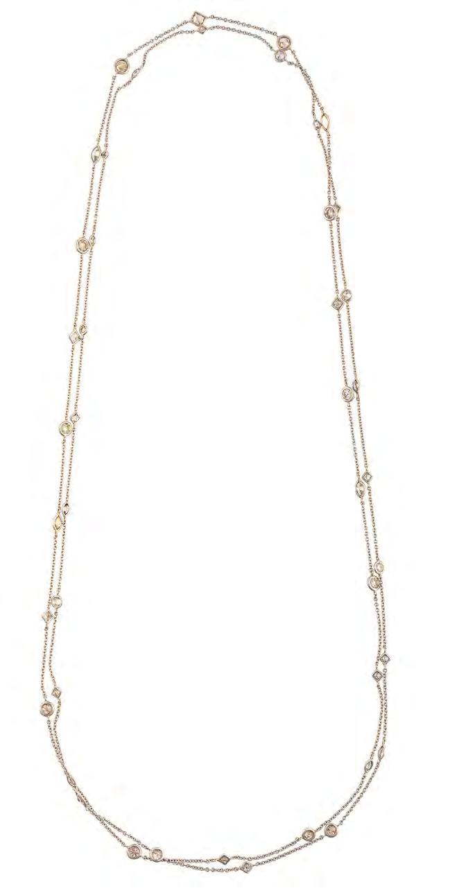 590. Platinum and Multicolor Sapphire Line Necklace, mounted with 82 octagonal step faceted cut multicolor sapphires, total wt. approx. 48.00 cts.; l. 17 1/4 in.; GGA and GIA reports.Please Note: Payment for all jewelry and all couture items MUST be made by cash, check or wire transfer., [10000 / 15000]