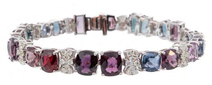 596. Platinum, Multicolor Spinel and Diamond Bracelet, mounted with 22 multi shape brilliant faceted cut spinel, total wt. approx. 22.81 cts.; accented with 82 round brilliant cut diamonds, total wt. approx. 1.59 cts.; l. 7 in.; GGA report. [3500 / 4500]