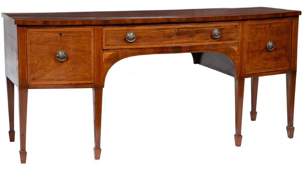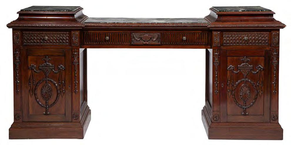 100. Georgian-Style Carved Mahogany Pedestal Sideboard in the Adam Taste, 20th c., inset marble tops, frieze drawer, each pedestal with small upper drawer, drawer and cabinet, lamb’s tongue surround, urns and swags, plinth base, Label reads “MADE BY HARRY L. MOSES, NEW ORLEANS, LA U.S.A.”, 39 1/2 x 83 x 25 in. (100.3 x 210.8 x 63.5 cm.) [1200 / 1800]