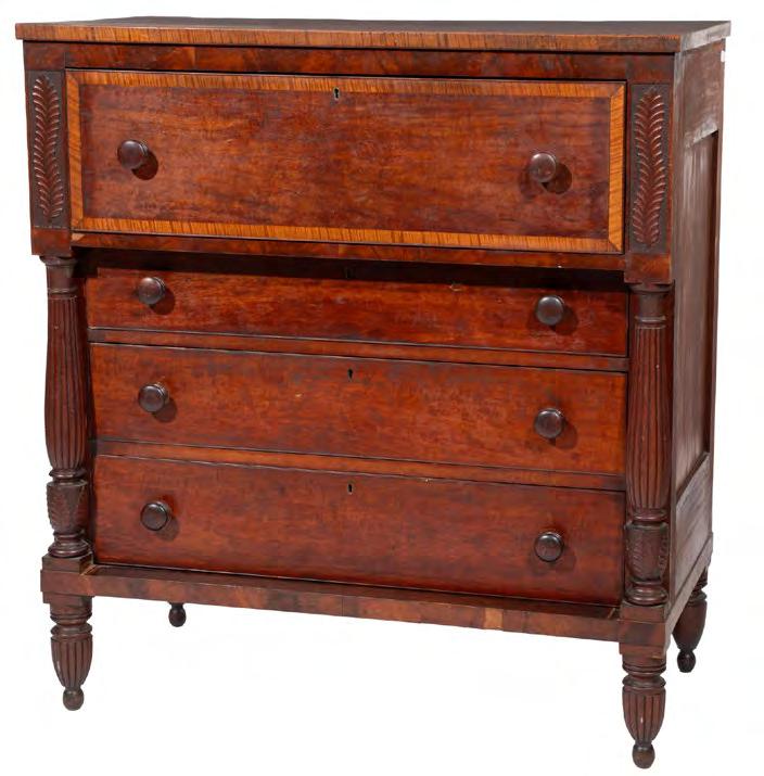 101. American Sheraton Inlaid Maple and Cherry Butler’s Desk, 19th c., Pennsylvania, maple banded top and escritoire drawer with fitted interior, foliate carved panels with punch ground, three graduated drawers, reeded columnar supports, plinth base, reeded tapered feet, 44 1/4 x 48 1/2 x 22 1/4 in. (112.4 x 123.2 x 56.5 cm.)