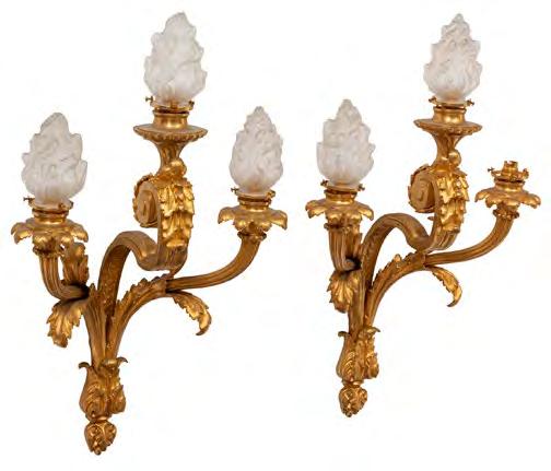 113. Pair of Empire-Style Gilt Bronze Three-Light Sconces, flame-form shades, 31 x 18 x 9 in. (78.7 x 45.7 x 22.9 cm.)