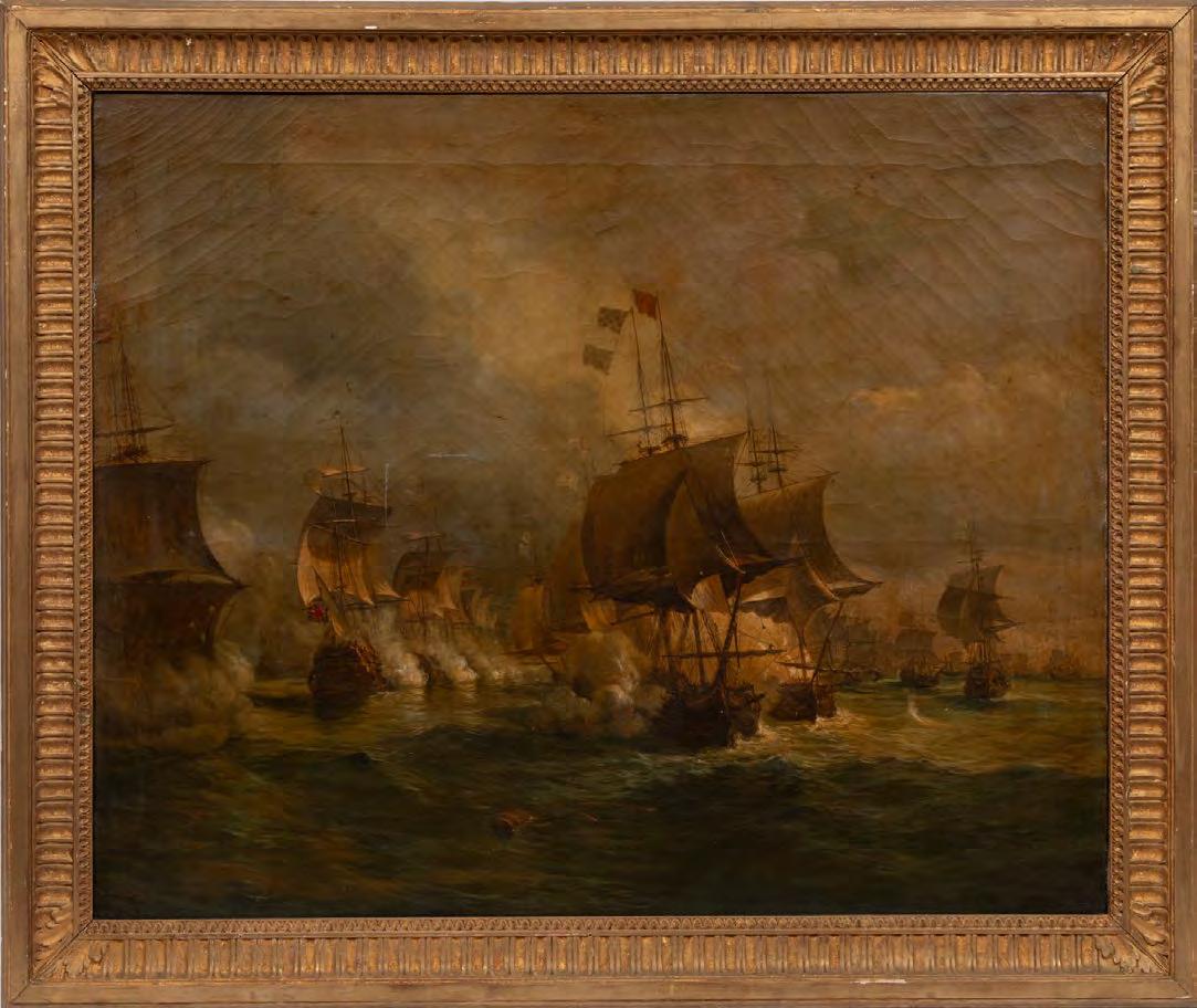 80. American School 19th c., “Whaling”, illegibly initialed lower right, framed., 16 x 26 in. (40.6 x 66 cm.), Frame: 19 1/4 x 29 3/8 x 1 in. (48.9 x 74.6 x 2.5 cm.) [600 / 800]