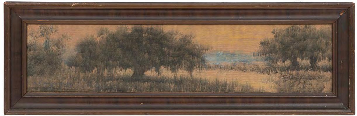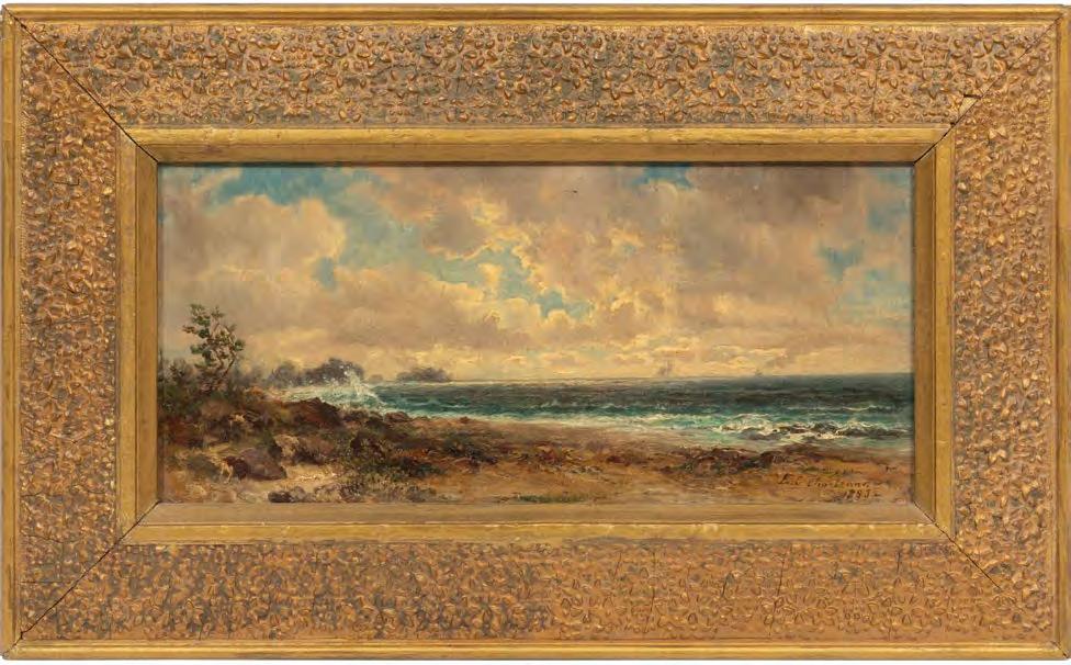 88. Esteban Sebastian Chartrand Cuban/New Jersey 1840-1884 “Paisaje Costero”, 1883, signed and dated lower right, partial label on stretcher, 2 typed labels, one with artist and date, on reverse of frame, framed., 7 x 15 in. (17.8 x 38.1 cm.), Frame: 12 5/8 x 20 5/8 x 1 1/4 in. (32.1 x 52.4 x 3.2 cm.)