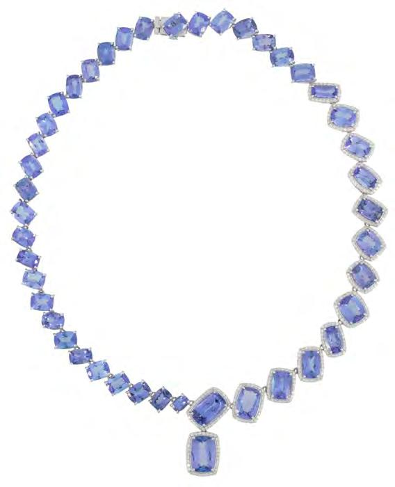 594. Platinum, Tanzanite and Diamond Necklace, asymmetrically mounted with 44 rectangular cushion mixed cut graduated tanzanite, total wt. approx. 116.05 cts.; some with bezels mounted with 364 round brilliant cut diamonds, total wt. approx. 3.25 cts.; l. 17 1/2 in.; GGA report. [25000 / 35000]