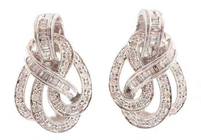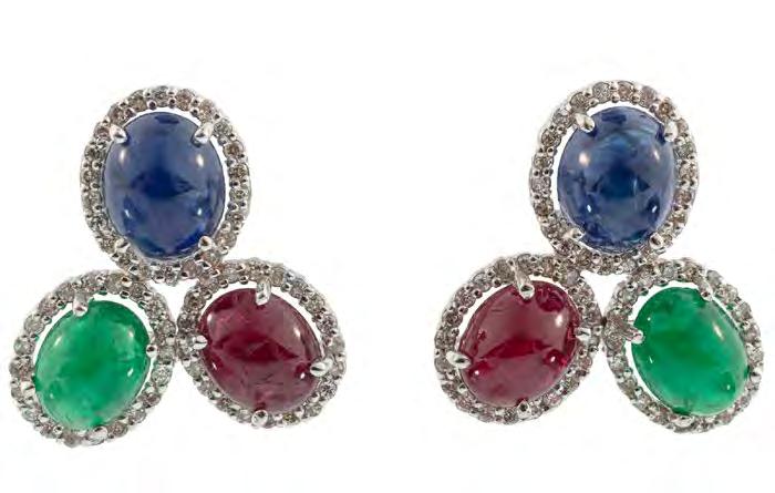 572. Pair of 18 kt. White Gold, Emerald, Sapphire, Ruby and Diamond Earrings, mounted with 2 oval cabochon emeralds, total wt. approx. 3.60 cts.; 2 oval cabochon sapphires, total wt. approx. 7.15 cts.; and 2 oval cabochon rubies, total wt. approx. 5.36 cts.; bezels with diamonds, total wt. approx. 0.74 ct.; l. 1 in.; 6.40 dwts.Please Note: Payment for all jewelry and all couture items MUST be made by cash, check or wire transfer., [2500 / 3500]