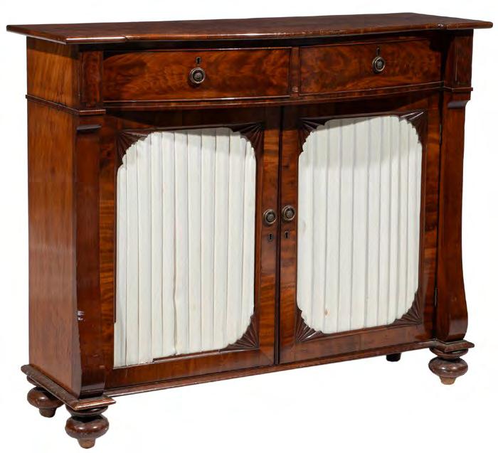 31. American Classical Carved Figured Mahogany Marble top Dresser, 19th c., probably New Orleans, shaped mirror with pineapple crest, scrolled supports, molded marble top, ripple molded frieze drawer, conforming double ripple molded paneled doors, fitted drawer interior, molded plinth base, disk feet, 82 x 51 x 22 in. (208.3 x 129.5 x 55.9 cm.)