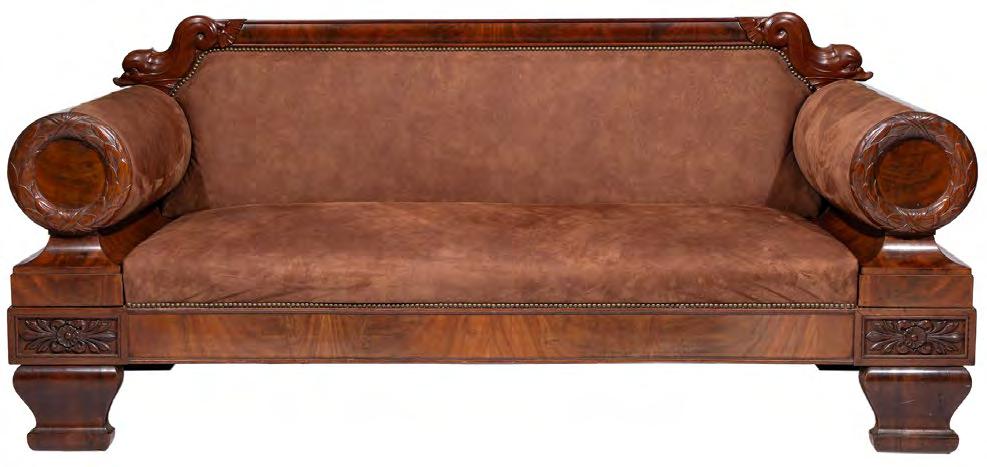 99. American Classical Carved Mahogany Sofa, early 19th c., Philadelphia, paneled crest rail flanked by dolphins, bolster arms faced with wreaths, paneled seat rail, rosette blocks, ogee feet, conserved and upholstered by Ruppert Kohlmaier, Jr., 37 x 84 x 29 in. (94 x 213.4 x 73.7 cm.) [1200 / 1800]