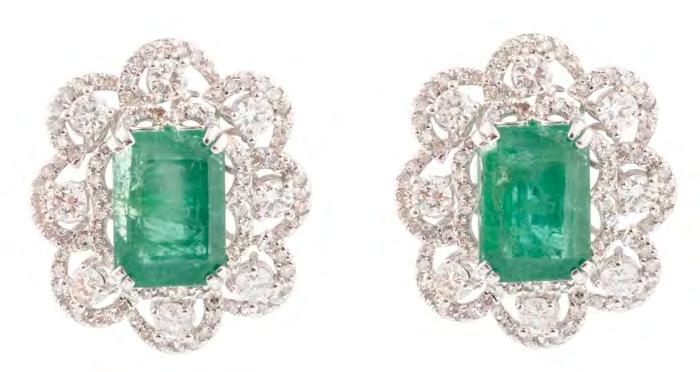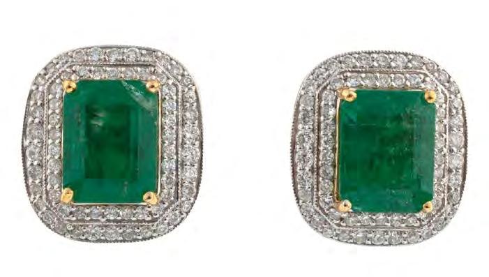 571. Pair of 14 kt. Yellow Gold, Emerald and Diamond Earrings, mounted with 2 oval cabochon emeralds, total wt. approx. 7.05 cts.; ballerina style bezels with numerous baguette cut diamonds; l. 1 in.; post backs; 10.04 dwts.Please Note: Payment for all jewelry and all couture items MUST be made by cash, check or wire transfer., [3000 / 5000]