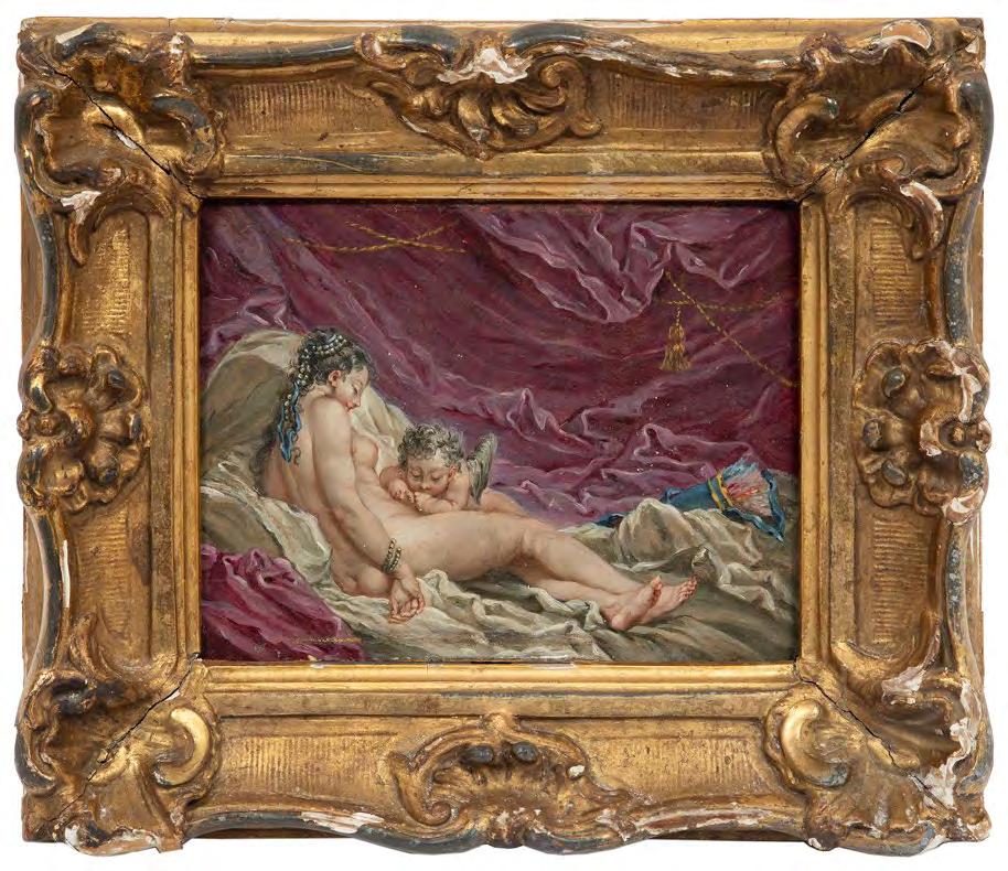 93. Aaron Bohrod American/Wisconsin 1907-1992, “Classic and Romantic Nudes”, signed lower right, artist and title label on reverse of frame, artist label and “Christie’s” labels on backing board, framed with artist plaque., 13 1/4 x 10 1/4 in. (33.7 x 26 cm.), Frame: 23 3/4 x 20 5/8 x 1 3/4 in. (60.3 x 52.4 x 4.4 cm.)